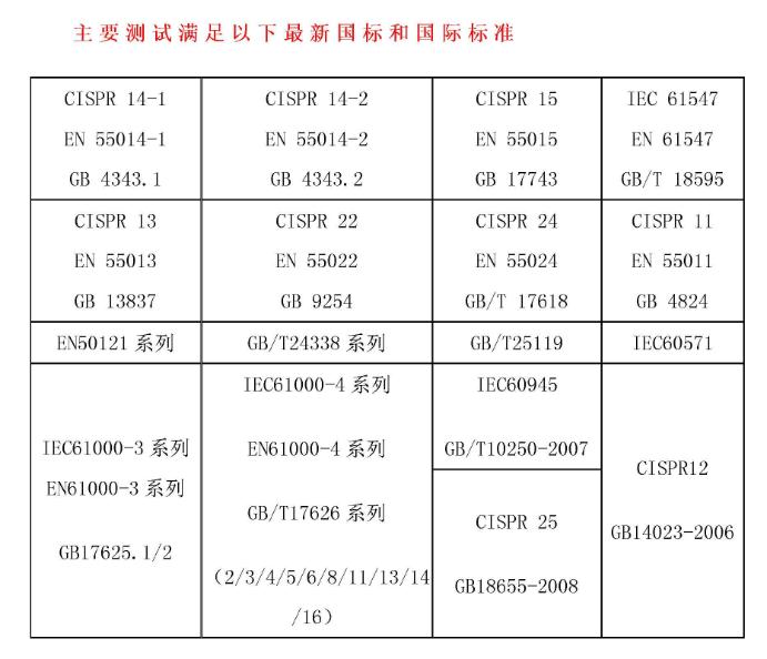 抗擾度測量(EMS):靜電放電(ESD)抗擾度、輻射電磁場抗擾度 、電快速瞬變/脈沖群(EFT/B)抗擾度、浪涌(雷擊)抗擾度、注入電流(輻射場感應傳導)抗擾度、工頻磁場抗擾度、電壓暫壓斷時中斷抗擾度、共模低頻傳導抗擾度、交流電源端口諧波諧間波和電網信號的低頻傳導抗擾度、振鈴波抗擾度、阻尼震蕩波抗擾度、脈沖磁場抗擾度等測試。