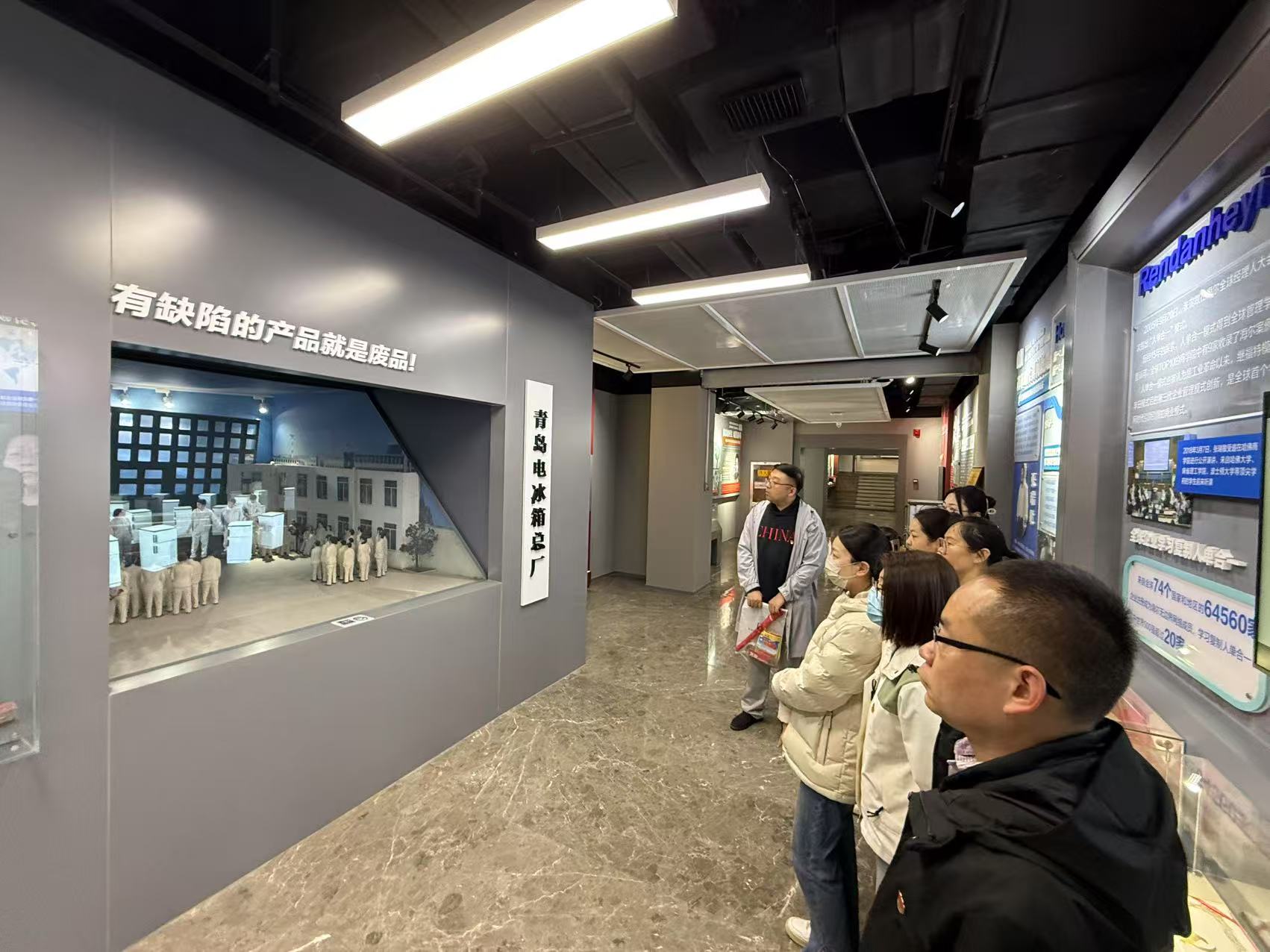 在講解員的帶領下,黨員們依次參觀了“工業之基”“品牌之都”“匠心之城”三大主題展廳及勞動體驗區。通過全息投影、沉浸式數字沙盤、幻影成像等創新技術,黨員們仿佛置身于歷史現場,親眼目睹郝建秀創新工作法的傳奇誕生,感受張瑞敏揮錘砸冰箱的震撼瞬間,領略許振超團隊九破世界紀錄的輝煌成就。每一個細節都生動展現了勞模精神、勞動精神、工匠精神的深刻內涵,讓黨員們深受觸動。